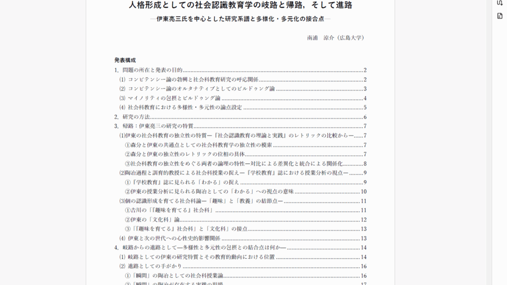 僕は,「人格形成としての社会認識教育学の岐路と帰路,そして進路─伊東亮三氏を中心とした研究系譜と多様化・多元化の接合点」。
